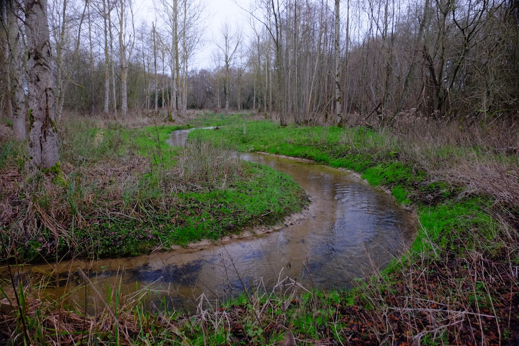 This is a brand-new river channel cut to connect a restored set of natural meanders (pictured above) with the main river. These pictures are taken more or less one year apart, immediately after the project was finished last winter and on 26th December 2015.