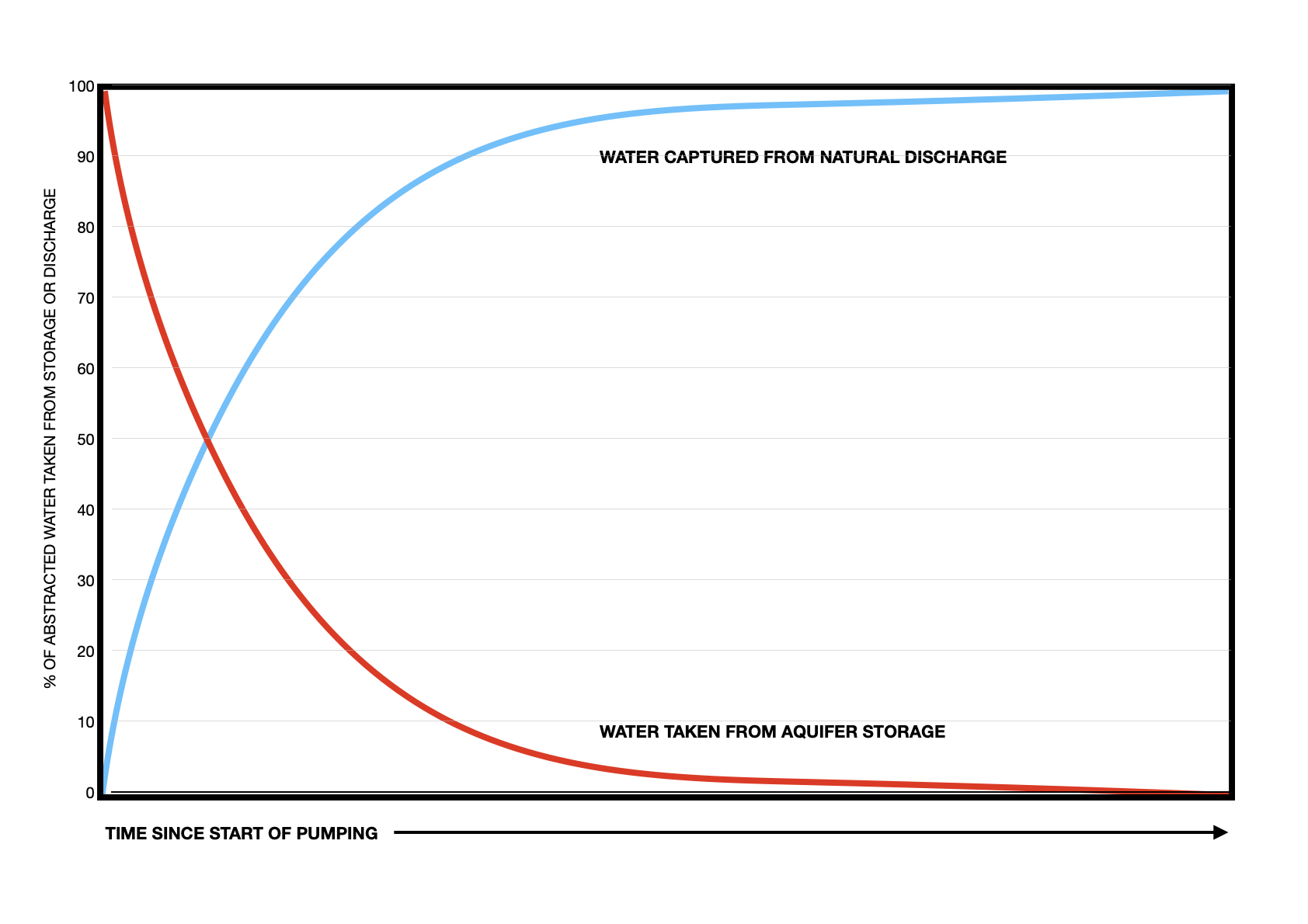 Over time, the depletion from former natural discharge approaches the pumping rate, until almost all is taken from the stream system.