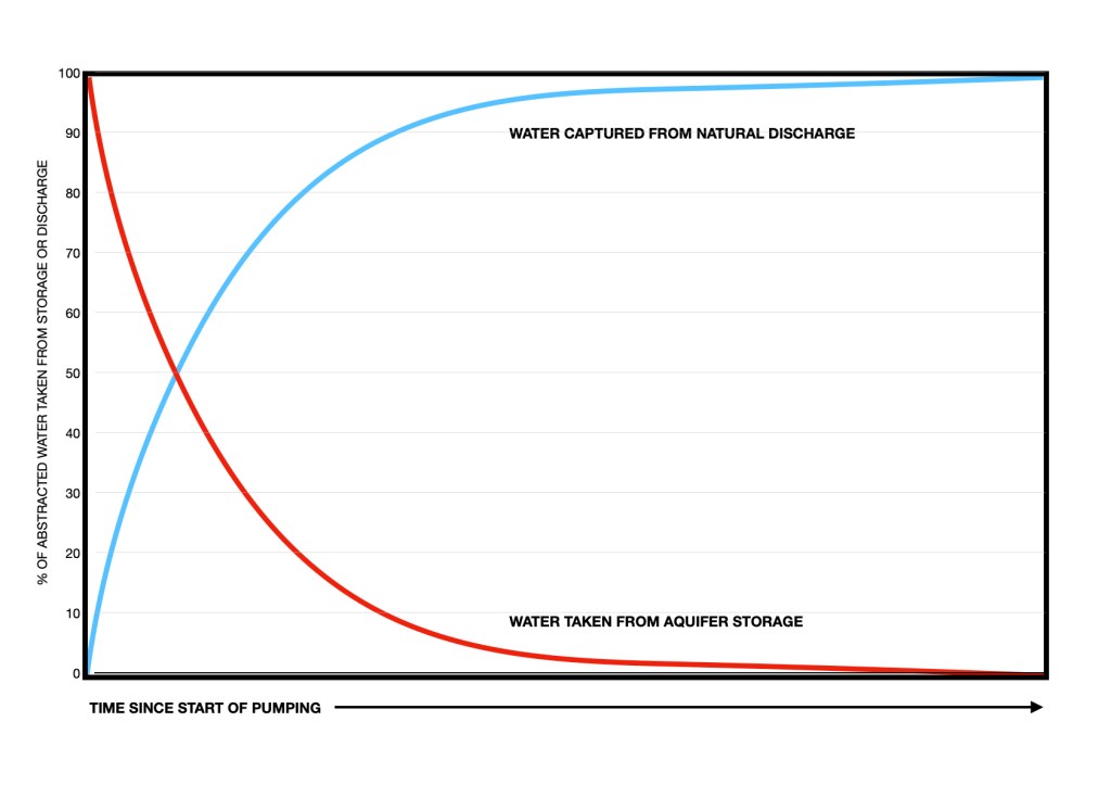 This is the same with an aquifer. A groundwater abstraction must first lower the water level in the aquifer in order to then capture former natural flow from the stream. Thus, in the first instance, an abstraction – depending on where it is sited – may have an almost undetectable influence on former stream flows while it takes water from the volume stored in the aquifer. Eventually, however, the abstraction will reduce the storage and lower the groundwater levels enough to establish a new dynamic balance in the level of the aquifer, after which ALL of the abstraction is captured from the former natural flow. This split over time between water taken from storage and then water taken from flow is illustrated in the diagram below.