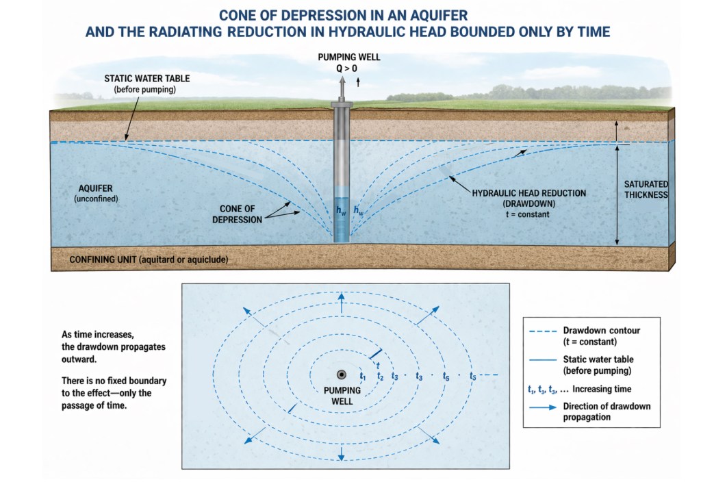 They argue this, in spite of the fact that the impact of any given abstraction extends – in theory – infinitely from the location of the abstraction, its only real boundary being time. The cone of depression is simply the measurable drawdown around a pumping well, forming a gradient that drives water to the wellhead. The edge of the cone is not a physical boundary at all, it is a detection threshold where the drawdown is less than any possible measurement error.