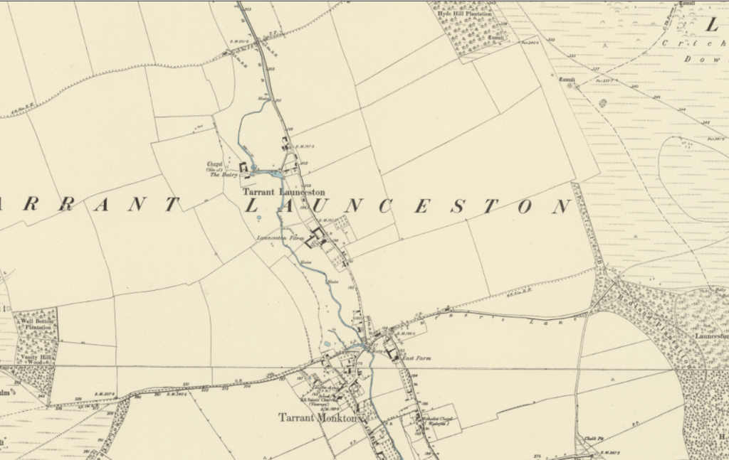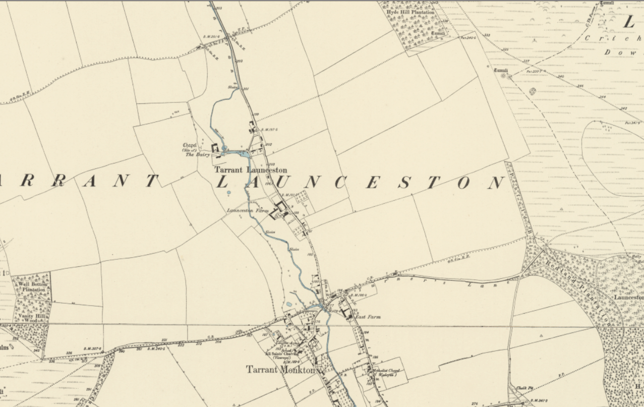 However, the extent – by that I mean the physical and temporal extent – to which the Tarrant is a natural winterbourne is the subject of some debate. Historical evidence strongly suggests that the Tarrant is only a natural winterbourne in its upper reaches downslope as far as Tarrant Launceston, where old maps and LiDAR indicate that a meandering channel, suggestive of perennial flow conditions, begins.