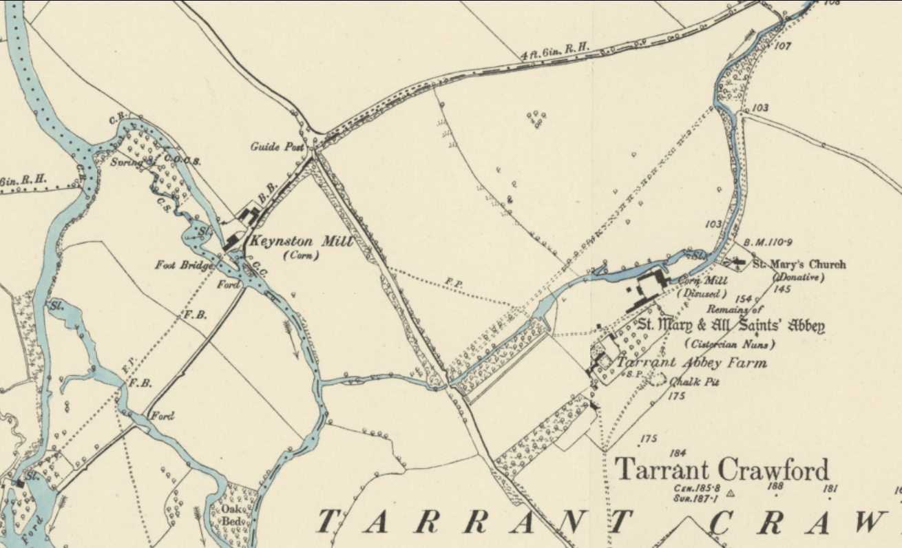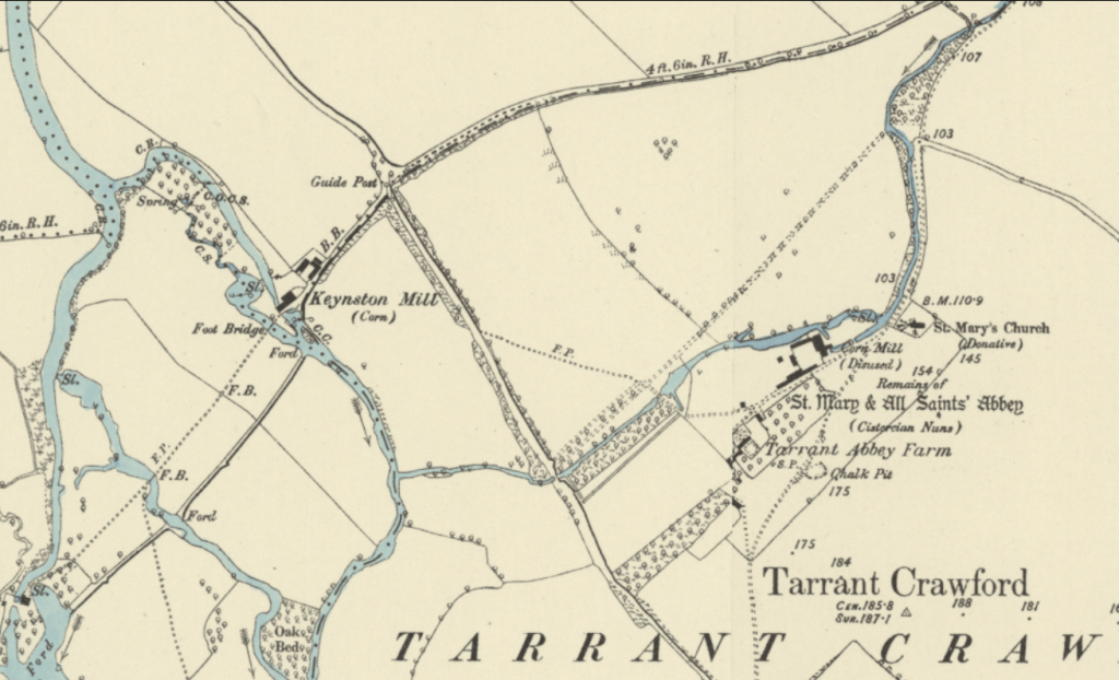 The mill site at Tarrant Crawford Abbey seems particularly anomalous to the modern-day ephemeral flow regime of the lower river. This was a substantial mill with a dedicated water-retaining structure and leat, sited very close to the confluence of the main Stour and another watermill – Keystone Mill – that would have been a better option and wholly reliable if the Tarrant had tended to dry.
