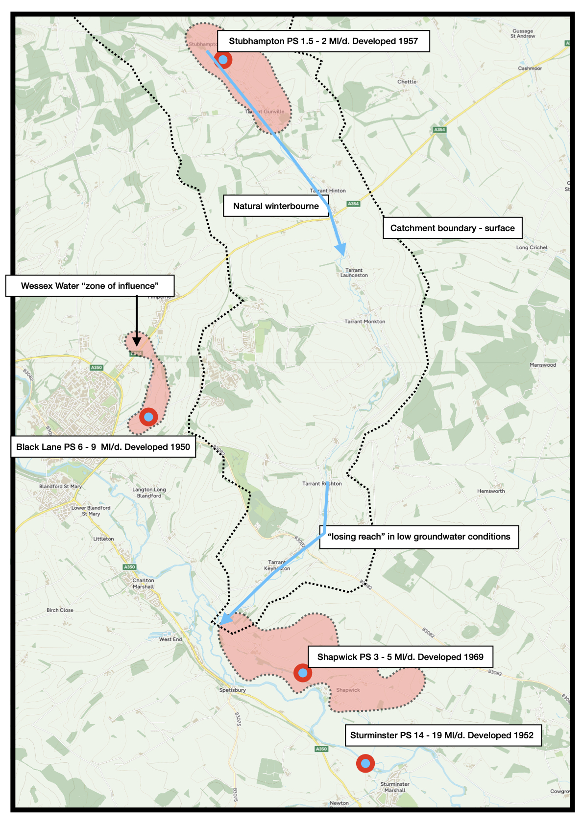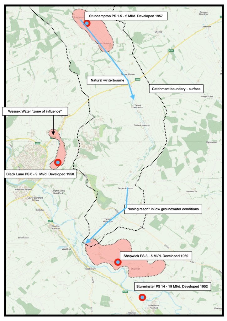 As John Lawson’s report shows, there are several abstraction pumps in and around the Tarrant, and groundwater abstraction has crept up slowly over the years. The one source within the physical, surface catchment – Stubhamptom – is relatively small and has been running since the late 1950s. But there are much bigger pumps at the aforementioned Black Lane (just over the catchment boundary), and Shapwick (close to the confluence with the Stour), and Sturminster Marshall (a little further down the Stour valley), as well as Corfe Mullen, which is slightly further afield.
