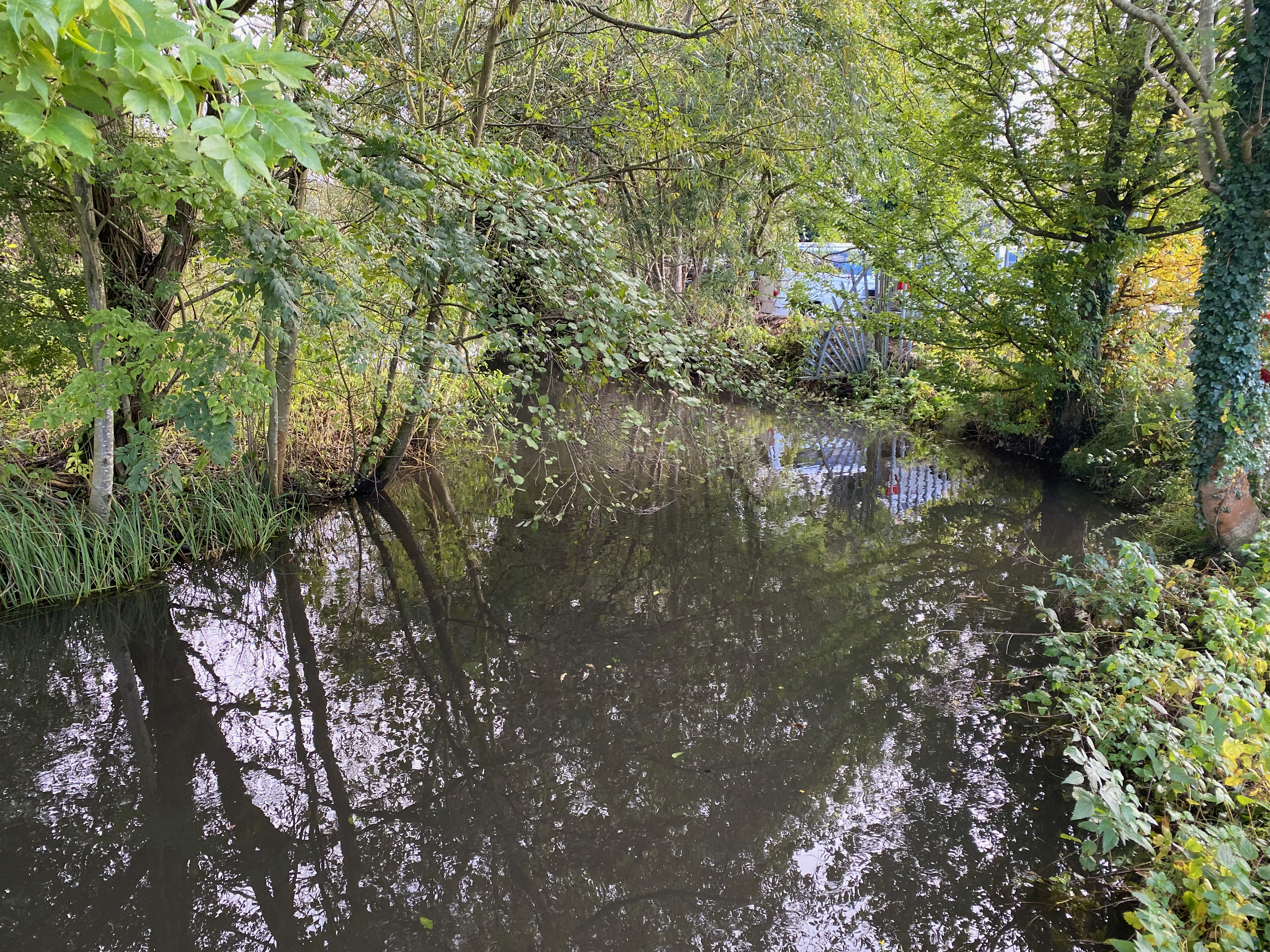 I also decided to go take a look myself. I wanted to know a bit more about whatever it was that had so undermined the intent I had invested in 12 months of working seven days a week: I deserved an answer, although I doubted I’d get one. I found the spot where the photo had been taken easily enough: a bend in the stream at the foot of the Mimram Road in Hertingford Bury, a cul-de-sac of industrial units. One of these units might have been uppermost in my list of suspects until I saw that the colour had obviously come from upstream of this point. A lady in a glass factory at the end of the road gave me the picture she had taken. The dye had come downstream quickly, she said, and dispersed quickly too: like a plug of vivid water, in other words. Someone had clearly chucked something into the river. Not so much a totem of cynical neglect by the regulators, then, as a totem of careless neglect by society.