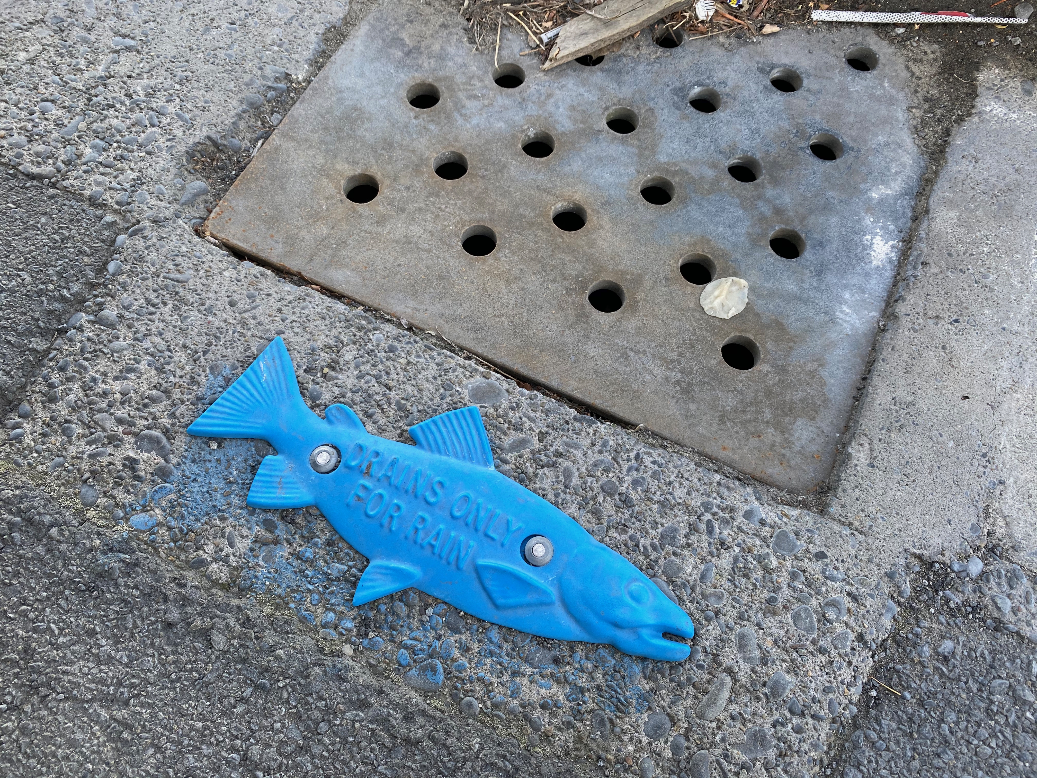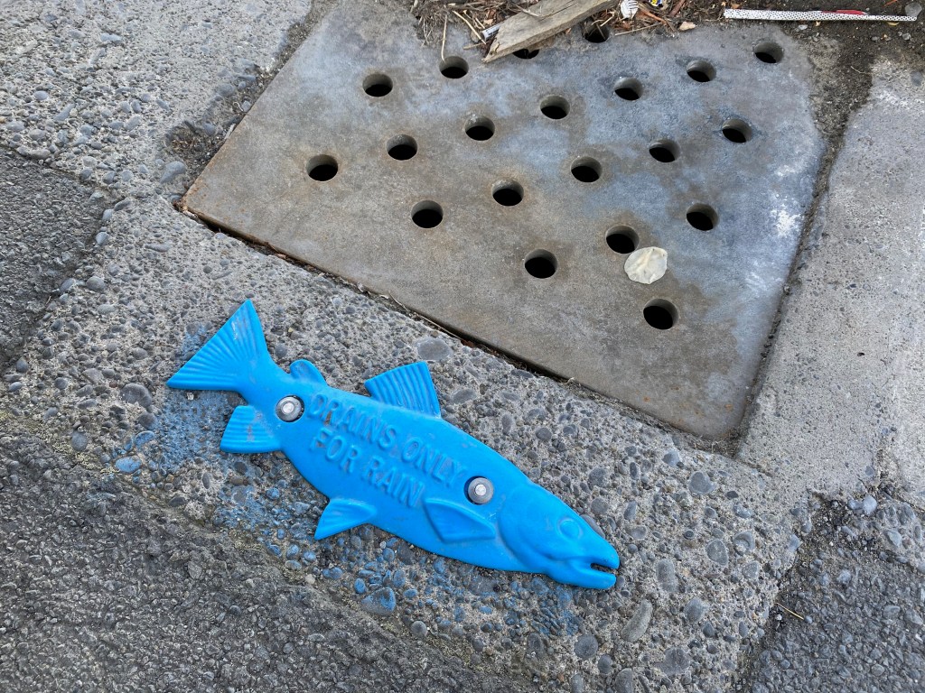 In Christchurch, New Zealand there are little metal fish-shaped plates pinned to the road by every drain, there to remind people that when you tip something down a drain, it ends up in a river. What this event really tells us is that we don’t care. We. Society. We don’t care. We chuck stuff down drains and don’t think about where it ends up or what it does. This time it was purple and apparently harmless and everyone noticed. Most of the time, no-one notices. And yet one drop of flea treatment on the back of a dog can kill all the insects in a long reach of river.