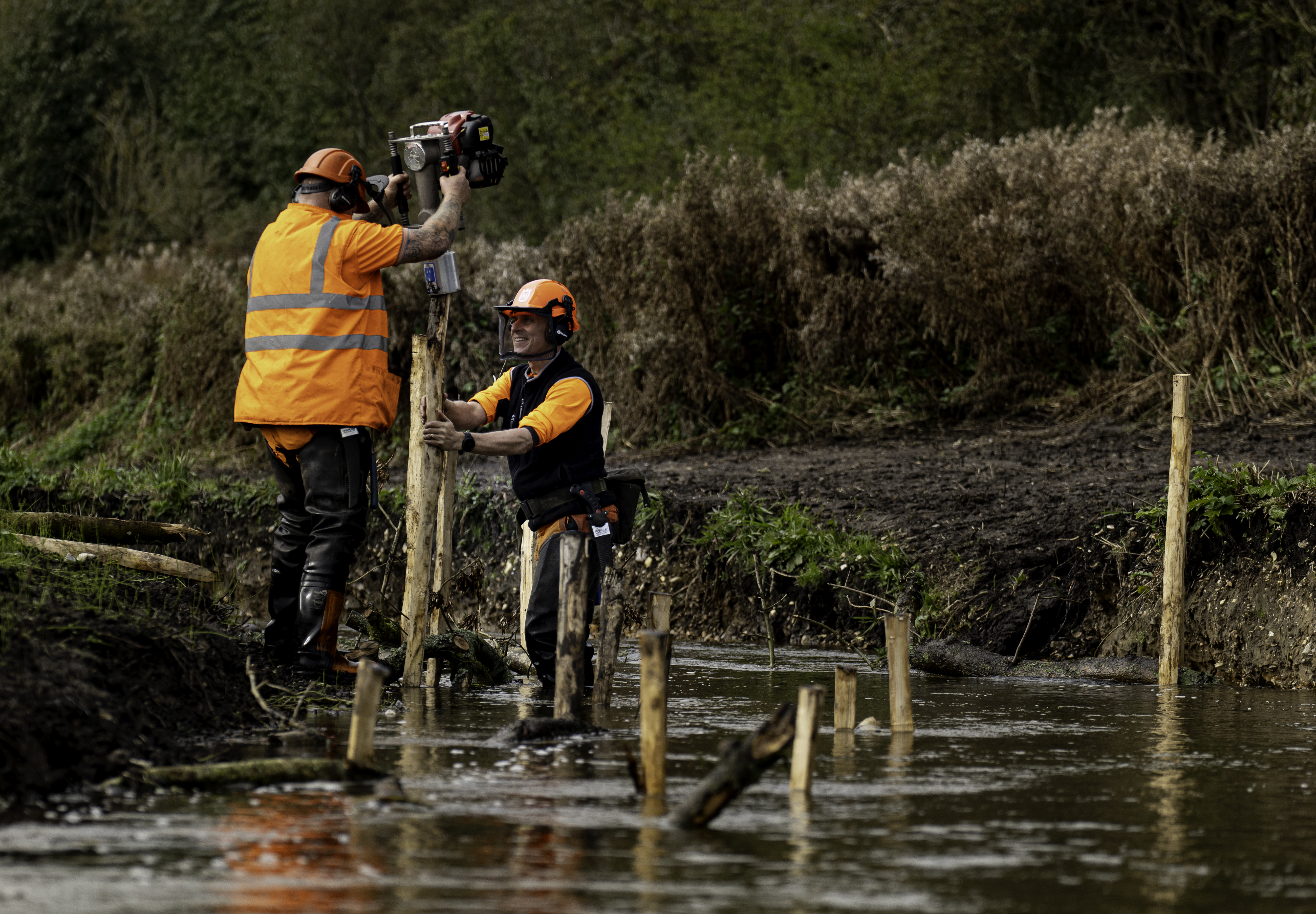 I work with an experienced team of foresters – Richard and Pete. Our approach is to imitate natural tree-fall and wind-throw: the interaction between the chalk stream and large woody material is critical to the development of natural processes and self-restoration. The horse is called Archie – he was used to pull timber along a delicate SSSI river-bank.